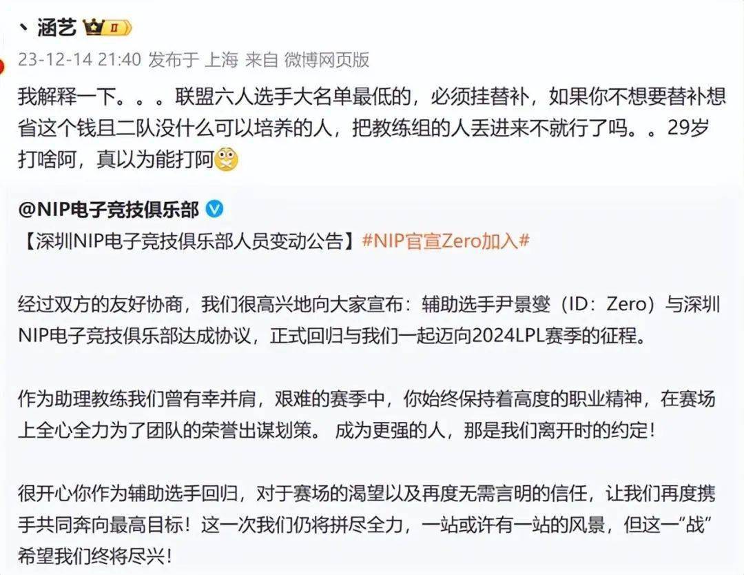 不过涵艺澄清了这个消息,他说LPL有规则,战队的队员必须有6位,有的队伍不想养一个替补占着位置浪费钱,就让助教去做这个“替补”。所以zero看似是辅助,实则还是助教。