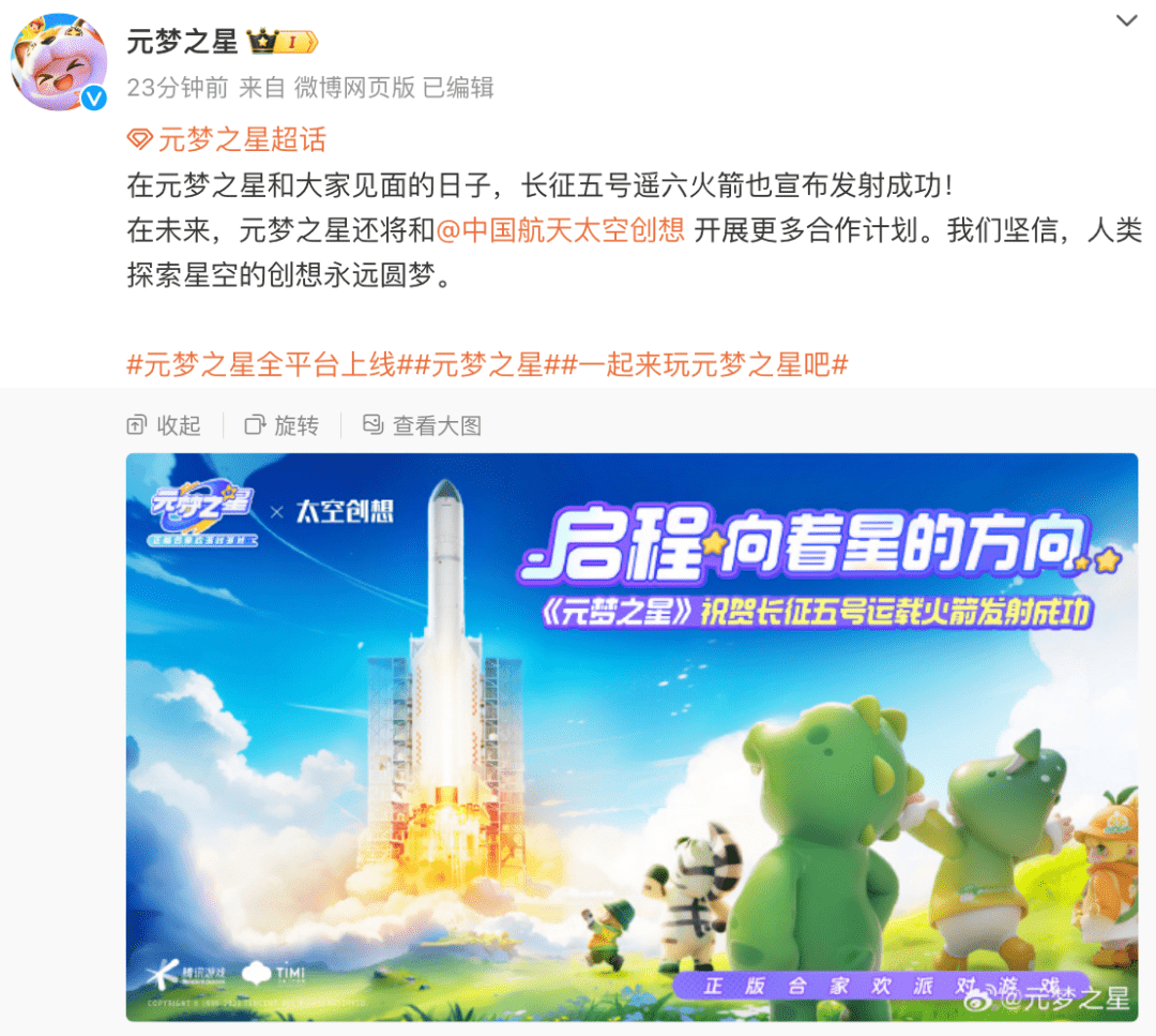 全平台上线当日,《元梦之星》又与@中国航天太空创想互动,祝贺长征五号运载火箭发射成功,为持续向着“星”的方向不懈探索的航天工作者们致敬,并预告未来还将展开更多合作计划。