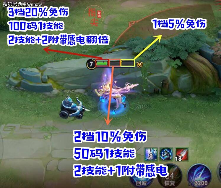 首先大家要知道新赵云的机制,血条上分为三档,满血一档,2/3一档,1/3一档,每一档一种免伤,分别是5%/10%/20%,每档12技能的效果不同,1技能每档增加50码距离,2技能每档增加一段伤害和附带不同伤害量的感电伤害,至于大招,挪走了感电伤害。