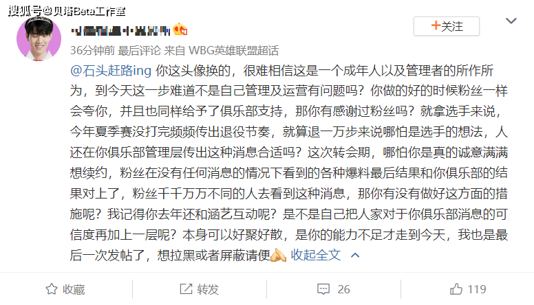 不知道WBG老板换这个头像,是撕破脸了,还是只是表达了一些自己被冲的不满。但是唯一可以确定的是,春季赛WBG但凡输了比赛,肯定会受到大量的嘲讽和攻击,现在双方的矛盾越来越激烈,春季赛WBG输了比赛后,微博下面的评论已经不敢想象了。