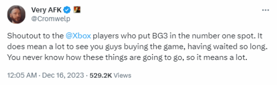 “为Xbox玩家欢呼,他们把《博德之门3》推上了第一名。让你们等了这么久之后,你们依然购买了它,这对我来说意义非凡。你永远不知道事情会如何发展,所以这真的很重要。”