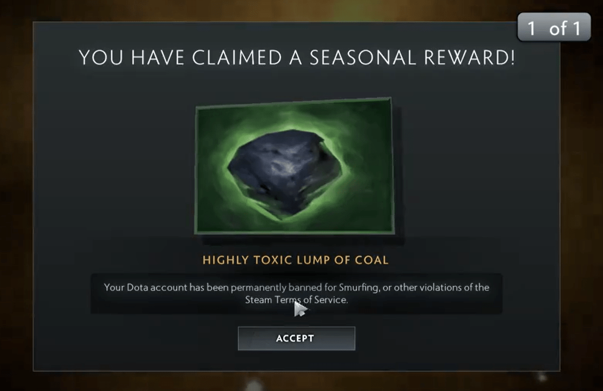IT之家注意到,《DOTA2》会向所有人发放一份“季节性奖励”,上了“淘气王”名单的玩家拆开礼物盒会收到一个“剧毒”煤炭块,并且被永久封禁(VAC)。