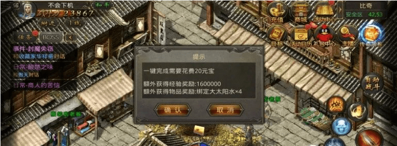 这个时候有小伙伴可能嘲笑我这个时候点掉日常四十五级以后怎么办?冲五十级怎么办?我负责的告诉你,不管你什么职业点掉第一个20的元宝的日常都不会影响你冲50的速度,再说了打宝的老铁也没几个开区第一天就冲五十级的,因为我们要花更多的时间去打BOSS和精英。我们要追求的是等级、元宝和时间上的高性价比。