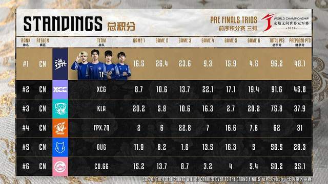 不过话说回来,在劫杯前序积分赛中,排名第一的是TE战队,XCG紧追其后。这两支队伍小有优势,都是40多分。但KLA战队和FPX.ZQ战队也是不甘示弱,分差都拉的不是很大。像三排赛,这样的继承分优势不算很大,基本都是一把大分局就能够追回来。但大家都知道,劫杯决赛都是要看选手的临场状态,不是每一把都能够完美发挥的。