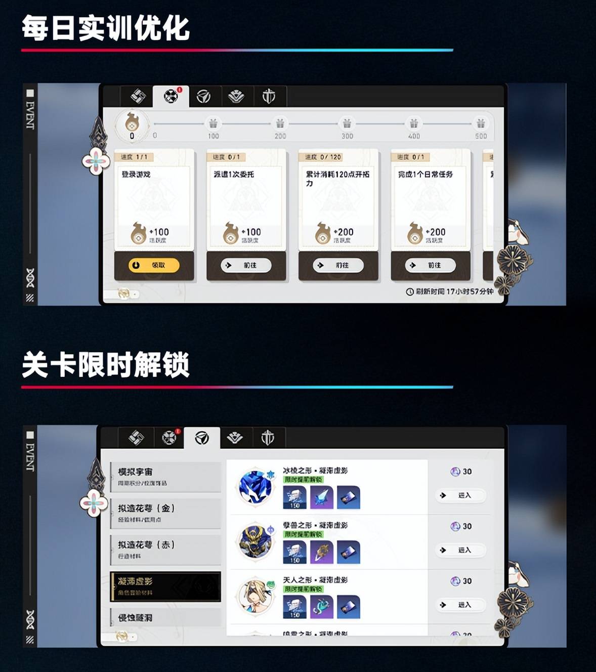 说明:除了忘却快速通关以外,500实训那个也会更简单完成了,登录游戏直接就有100点了;然后后入坑的玩家,还没解锁的素材关卡,也能先去打,更方便培养角色了。