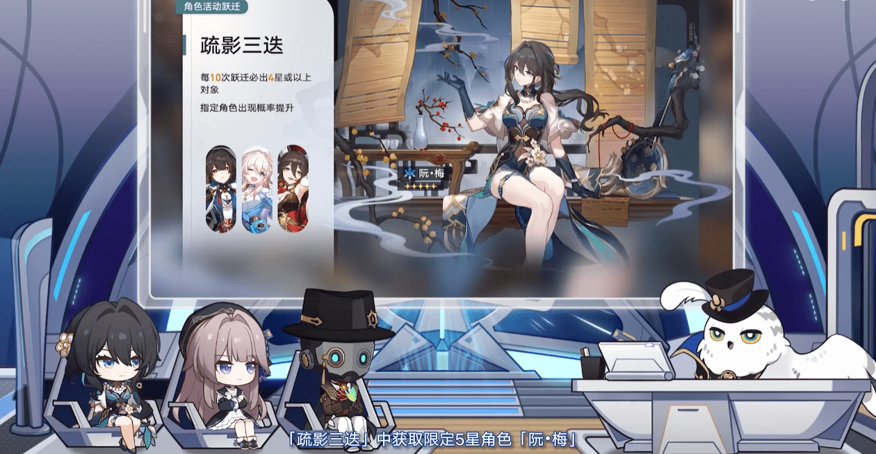 上半段:5星角色阮梅(新)+5星角色刃,4星角色雪衣(新)+三月七+停云。