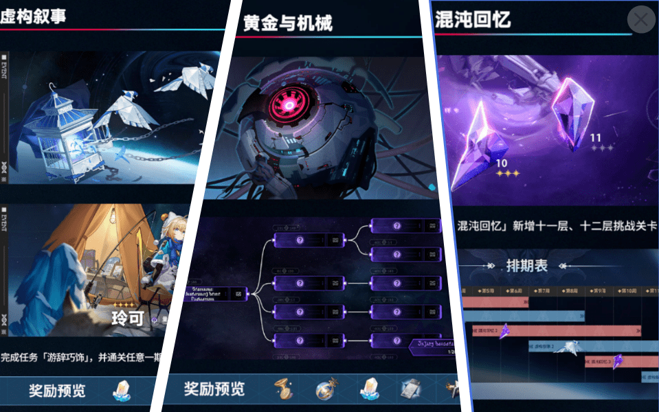 虚构叙事:新的常驻玩法,与混沌回忆轮流刷新,看的是限定轮数内的杀怪数。