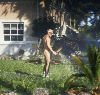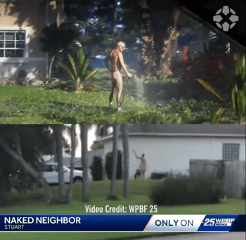 这一幕也是佛罗里达的奇葩新闻,发生在 2018 年。新闻中的主角老哥被疯狂投诉,因为他有两个爱好,一个是在院子里干活,例如修剪草坪、修理汽车,另一个爱好是不穿衣服。