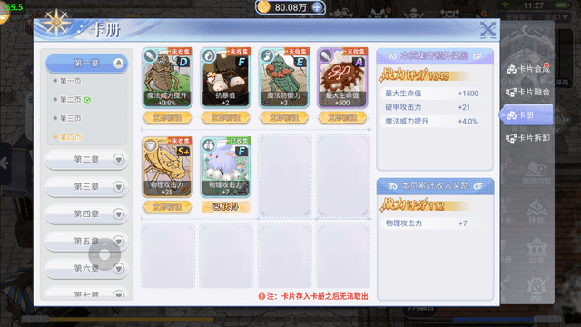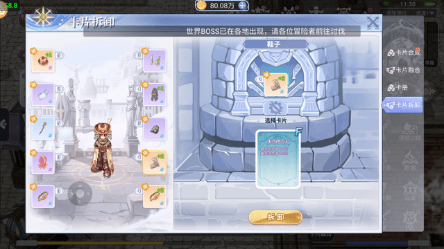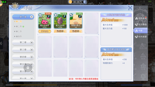 玩家可以根据自己的策略和游戏需求,选择不同类型和等级的卡片进行组合。将卡片放入卡册也会有战力加成,可以将卡片放入武器里进行镶嵌,卡槽不够可使用从商店购买黑精灵之锤进行开槽。