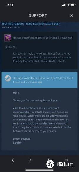 由于电子产品内部零件甚多,因此无法确定这些零件运行时温度升高后会否产生对人体有害的物质,所以Reddit一名玩家@Metapod100向Valve查询,到底“吸Steam Deck”是否安全。Valve官方回应指, Steam Deck正常运行时排放的气体没有安全问题,但仍不建议玩家主动吸入电子设备排出的气体。