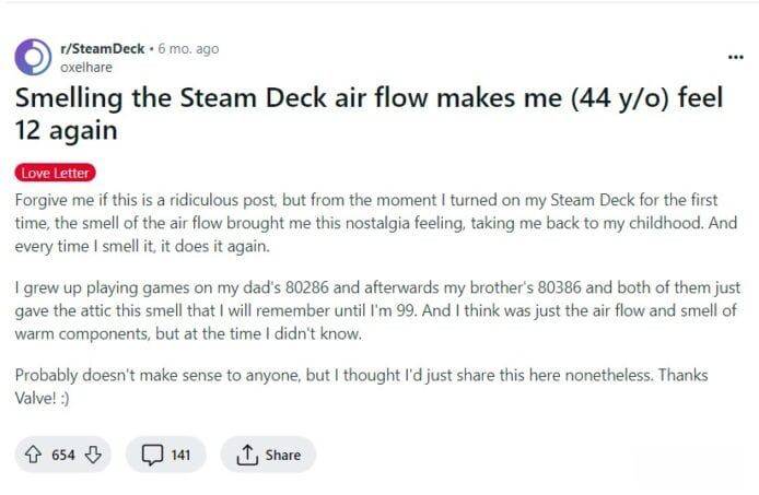 除此之外, Reddit上也有网友 @oxelhare表示他已经44岁了,但每次闻到Steam Deck排气口的味道时也会觉得自己像是回到12岁般样。
