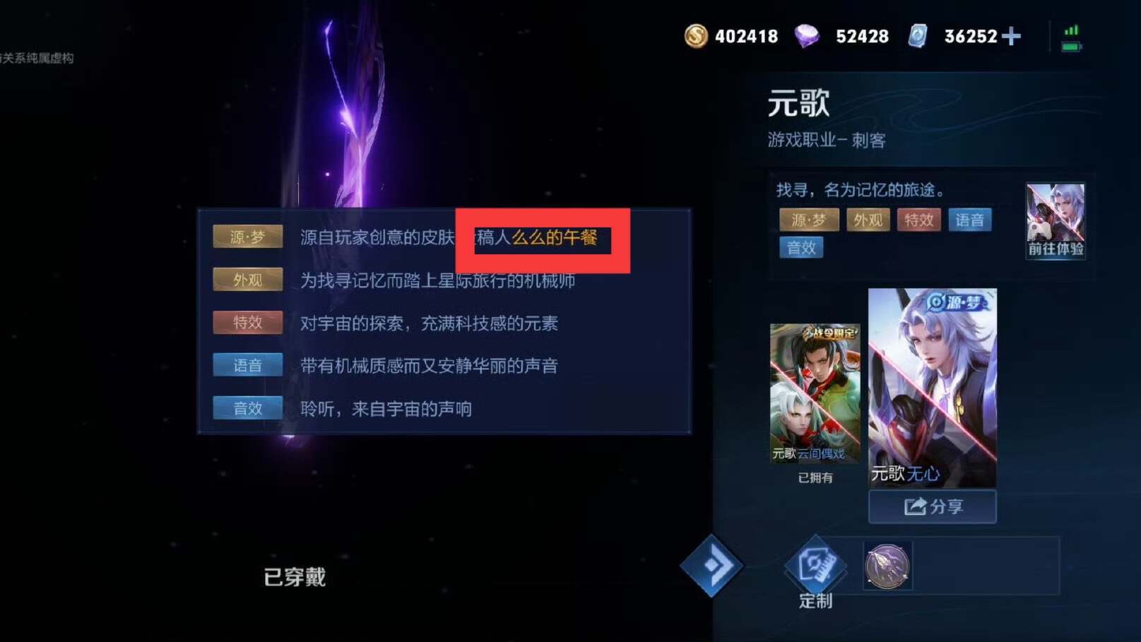 然后源梦皮肤也迎来了一些小改动,在蒙犽的源梦皮肤上线之后,有玩家发现所有的源梦皮肤都增加了一个新的内容,那就是皮肤介绍里面会有有源梦皮肤的设计稿投稿作者。
