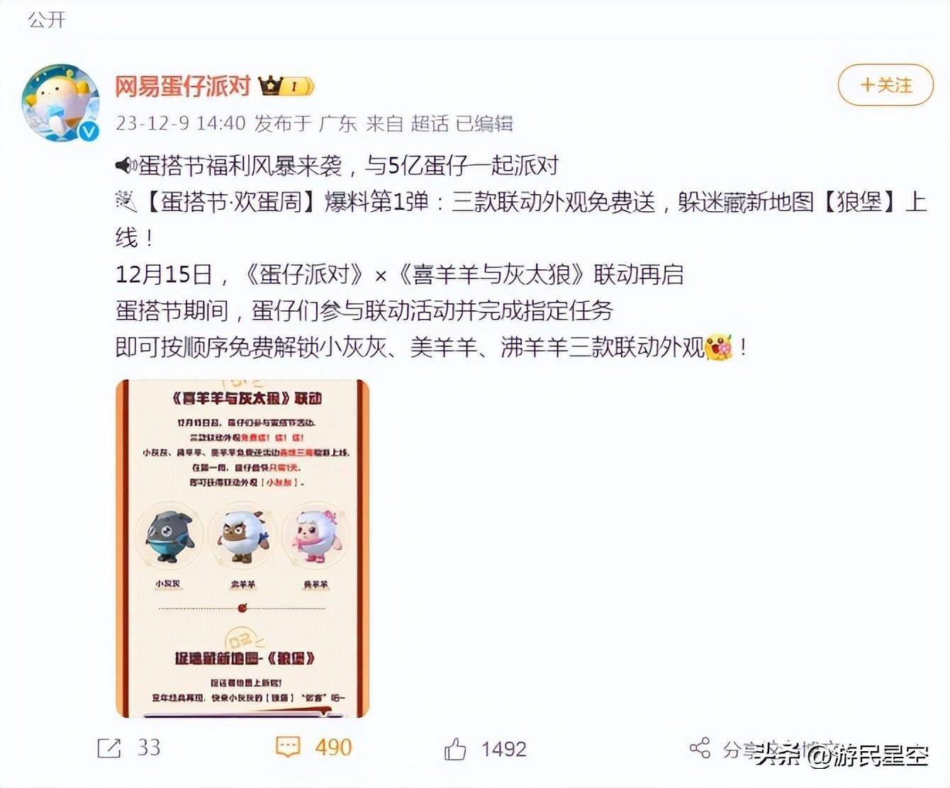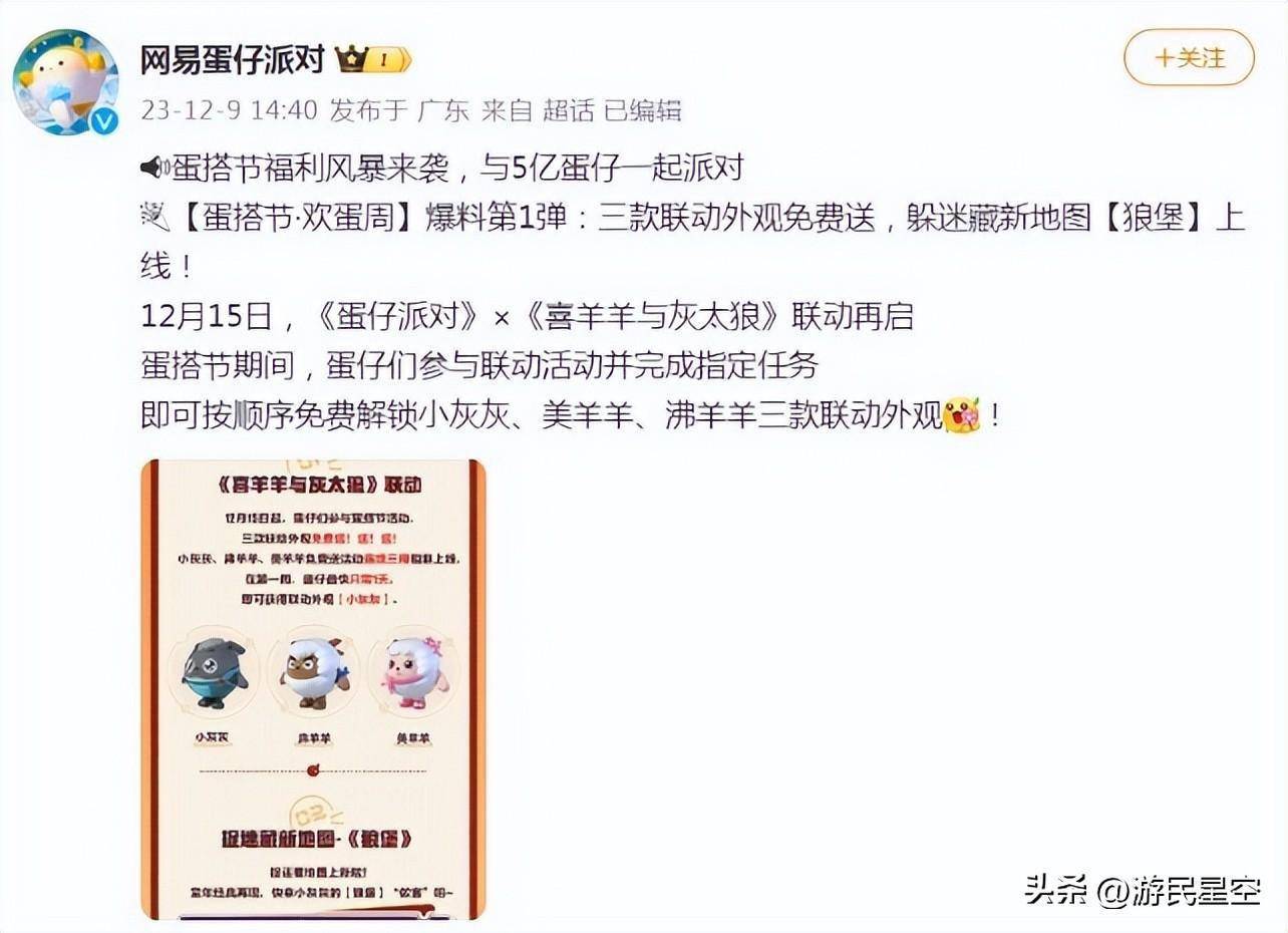 就比如这次与《喜羊羊与灰太狼》的联动返场活动,官方表示联动公告中推出的这三款联动皮肤是完全免费的,玩家们能够直接在游戏中领到这些经过了精心设计的蛋仔皮肤,而若是再考虑到此次联动还可能付出的商业授权成本,可以说这回《蛋仔派对》官方为了这次的“蛋搭节”真是下了血本。