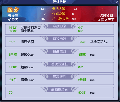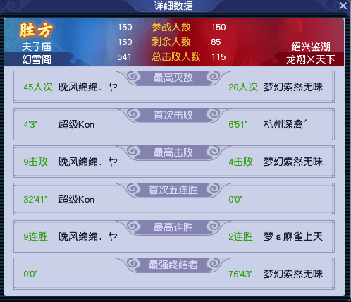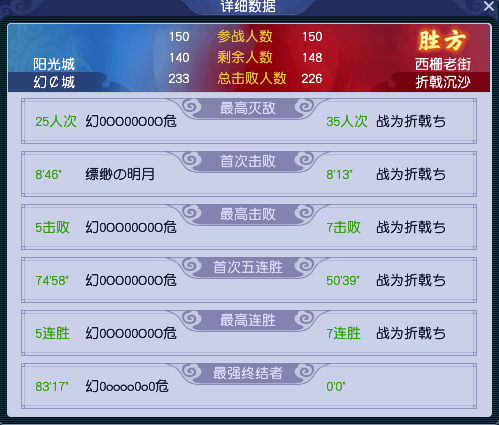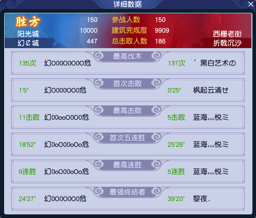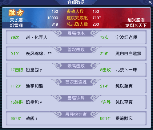 比赛结束时,【幻雪阁】一共领先了2803点建筑完成度和59个总击败人数,轻松获得胜利。