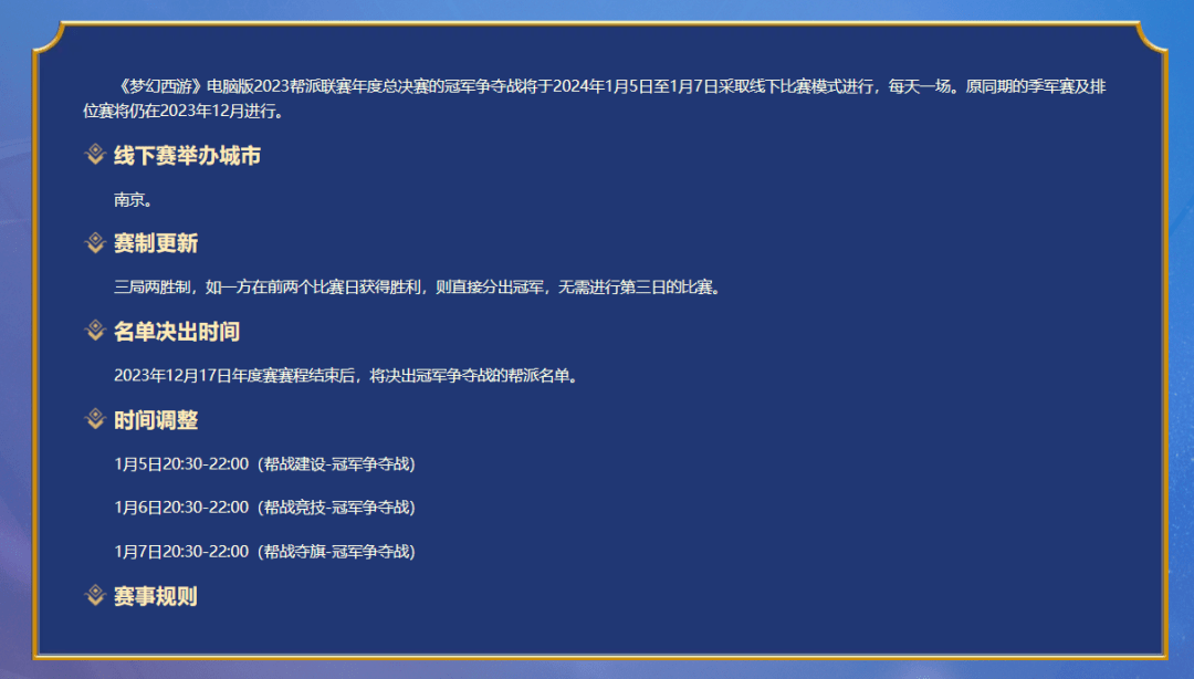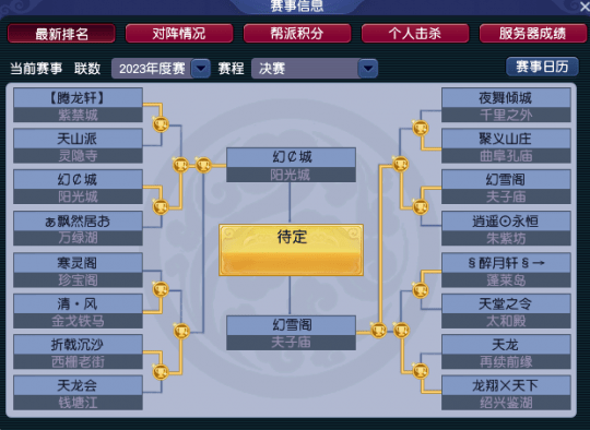 今日,备受玩家关注的梦幻西游帮派联赛已经选出了“2个线下”名额,阳光城服务器的【幻¢城】将与夫子庙的服务器的【幻雪阁】会师南京线下,于2024年1月5日至2014年1月8日角逐最终最终的年度联赛冠军。下面,就带大家回顾一下他们的半决赛历程吧!