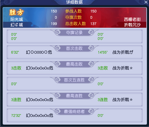 在周六竞技环节中,先输一阵的【折戟沉沙】选择破釜沉舟,将带队人员名字全部改为“战为折戟”。由于双方都是硬实力顶尖的帮派,整场比赛都打得非常焦灼。不过,由于【折戟沉沙】盯人能力极强,导致【幻¢城】帮派实力较弱的队伍被清出场外,以148:140的剩余人数拿到胜利。