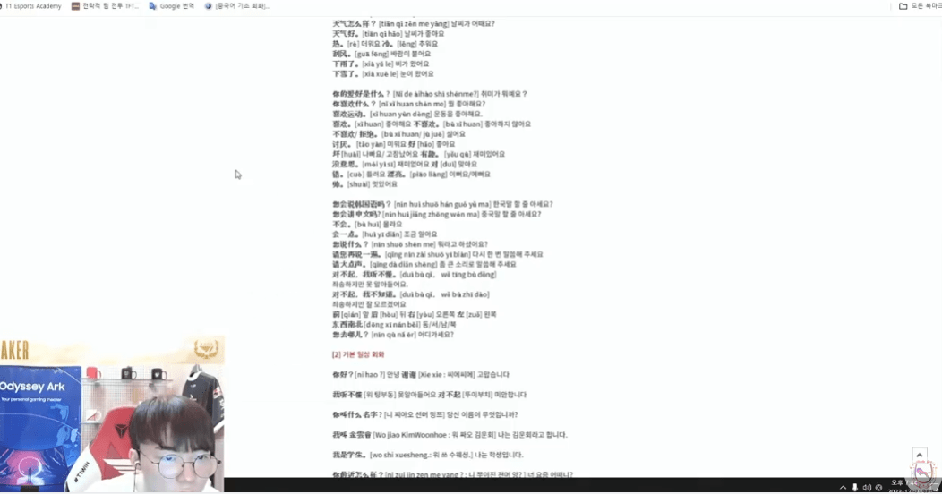 利用回城,走出去,阵亡泡温泉等时间,Faker会切出去在网页上学习中文,利用转化成的拼音来作为一些基本聊天使用。