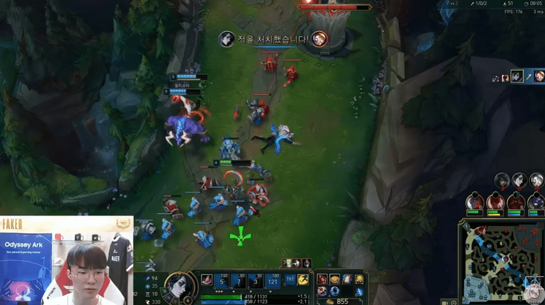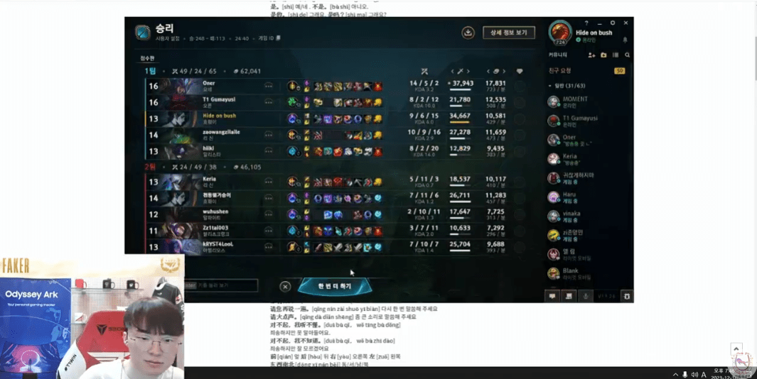 Uzi的前期几乎都是围绕下路在Gank,加上小超梦的牛头辅助不错,这也是帮助Faker的异画师取得了很好的发育。中单是Oner的永恩了,上单是Gumayusi的奥恩。因为前中期发育太好,也是轻松顺利拿下了大龙,而Faker这场比赛最让人在意的是,他居然一边打比赛一边在切出去学中文!
