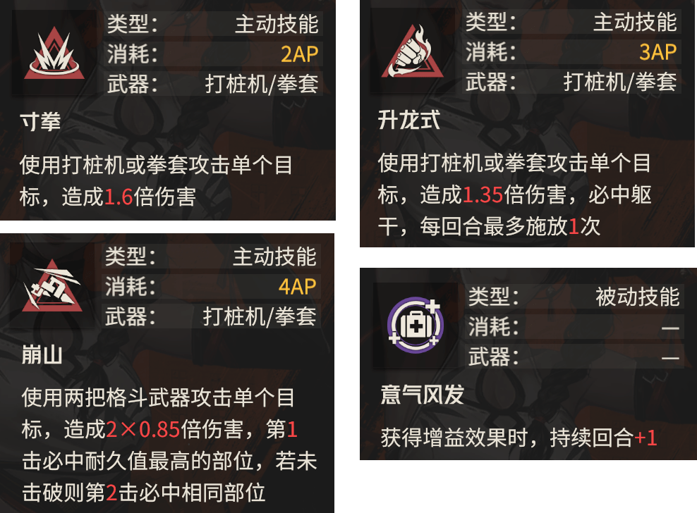 然后针对红的8个技能,大家重点关注其中的【升龙式】、【意气风发】、【寸拳】和大招【崩山】即可,其余4个技能并非无用,只是常规战斗用到的地方不多,而虹在开出大招前一般建议带【寸拳】+【意气风发】+【升龙式】这3个技能,这里简单汇总下其效果与用法: