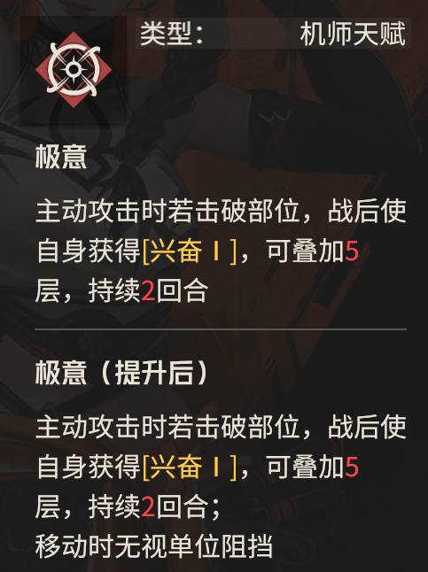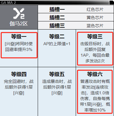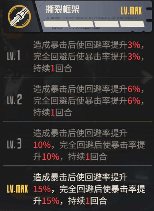 - 【兴奋】buff在后期伽马2区开了后会解锁同时提升回避率+3%的效果,所以此时的【兴奋】buff才是完整版的状态,联动“格莱杨”的【撕裂框架】效果更是相得益彰,待会说机兵的时候还会详细讲到这点