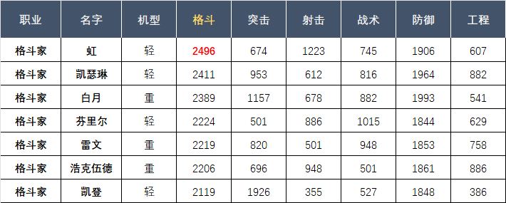 首先作为一名格斗家,以近战攻击为核心输出手段的虹具有所有格斗家中最高的格斗属性,同时针对同属格斗家的S级机师凯瑟琳和白月而言,虹的格斗属性可谓是遥遥领先......遥遥领先,这也一定程度上保证了其不俗的输出能力。