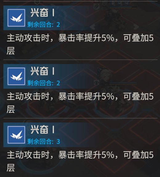 - 不同于过去许多同类型战棋游戏中可积累层数的buff,【兴奋】的每一层都是单独积累的,大家参考下图即可,所以会出现某个【兴奋】只剩2回合,某个【兴奋】还剩3回合的情况,而此buff最高可积累5层,如果你在某次行动前已经积累了5层,则新的一次击破会优先替代掉那个剩余回合数最低的【兴奋】buff!