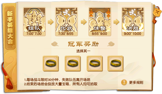 在新服开启后的第二、三、四天每天晚间19:00-22:00,连续三场。19:30正式开始比赛,20:55强制结束PK,21:00开启决胜模式buff,22:00积分判断胜负,决出胜负后进入颁奖流程。