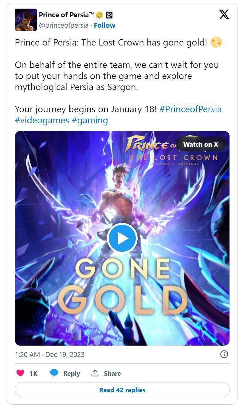 育碧蒙彼利埃开发的《波斯王子:失落的王冠》是该系列的一款全新2.5横版冒险游戏,现在终于“Gone Gold”(开发完成,确定内容并开始批量生产)。游戏的官方推特宣布了同样的消息,开发商表示他们迫不及待地想让玩家“以萨尔贡的身份探索神话中的波斯”。
