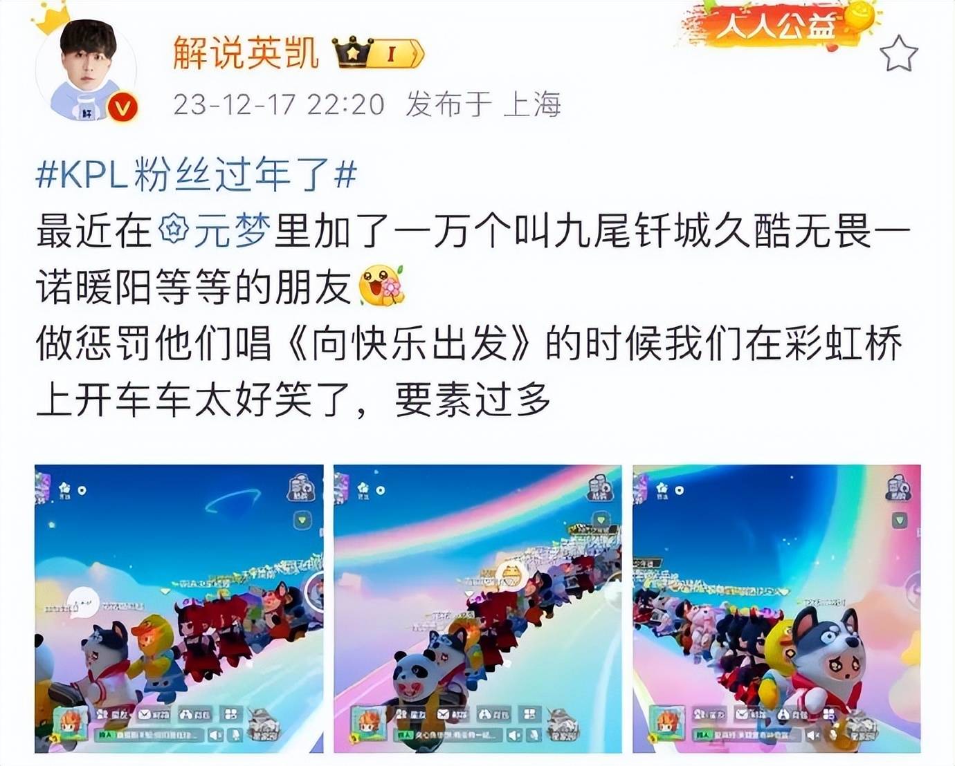 这款游戏就是12月15日正式上线的《元梦之星》,一款由腾讯出品的合家欢派对游戏。在这款游戏里,你可以和你的朋友、家人、同事,甚至是你喜欢的明星一起玩各种有趣的玩法,享受轻松欢乐的时光。而迪丽热巴,就是这款游戏的忠实粉丝之一,她的游戏ID叫做“小肠蘸辣酱”,让人想不明白小仙女这是起的什么鬼名字!