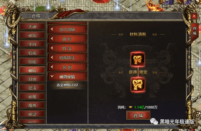 5.神兽坐骑可通过游戏运营活动获得LV1级坐骑神兽。要获得更高级的坐骑,需使用合成系统将两个相同等级的坐骑神兽合成为更高级别的。合成过程中消耗大量元宝,成功率为100%。