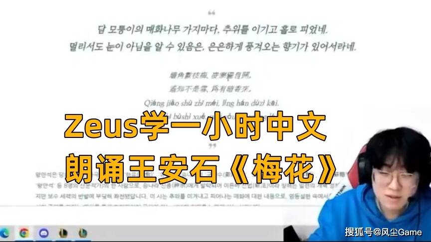 和Faker一样,上单Zeus也在直播时学中文,他的学习能力更加夸张,仅用一个多小时,就已经达到了可以念诗的水平了,在直播中给观众朗诵了王安石的《梅花》,岑参的《白雪歌武判官归京》部分片段,如此来看,中文似乎真的没那么难学,问题只在于想不想学而已。