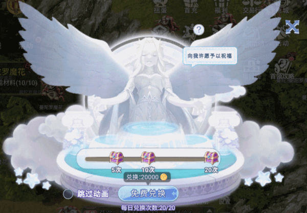 2. 「许愿池」玩法:每次兑换保底获得20000Zeny,有概率触发更高的神佑倍数,最高可获得10倍!每天有免费兑换次数,使用后6小时冷却。如果管理时间得当,一天最多可以有4次免费机会。
