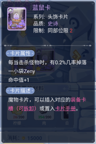 4. 「蓝鼠卡」:挂机时有0.2%的几率掉落一小袋Zeny,积少成多也是一笔不错的财富!