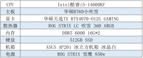 首先为偏爱浅色主题主机的玩家推荐一套颜值实力俱佳的酷睿14代白色主题平台。以华硕B760小吹雪主板为核心,搭配Intel酷睿i5-14600KF处理器、华硕天选TX RTX4070-O12G GAMING显卡等硬件,以及其他ROG桌搭设备组建而成,不仅拥有出众的颜值,性能更是无比强悍,可高画质流畅运行各类3A大作,为玩家带来无与伦比的游戏体验。