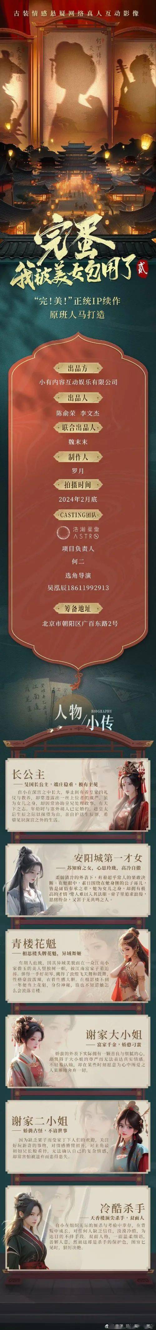 从官方提供的信息图来看,本作为古装情感悬疑网络真人互动影像。将于2024年2月底开拍。