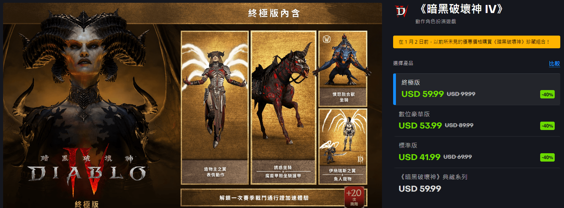 《暗黑破坏神4》又打折了~这次是全版本打6折,这次的圣诞节促销活动截止到1月1日。