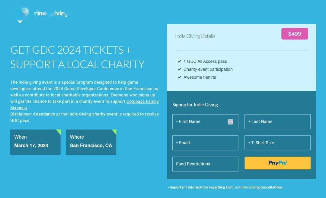 在 2024 年 3 月 17 日之前,您可向 Indie Giving 捐赠 499 美元,来获取售价 1879 美元的最高档门票(和一件超棒的 T 恤)。捐赠者不会直接得到这些物品,而是会受邀在 GDC 2024 举办的前一天,参加旧金山慈善机构 Compass Family Services 组织的人道主义服务项目。在成功完成社区志愿服务后,才会获得门票。