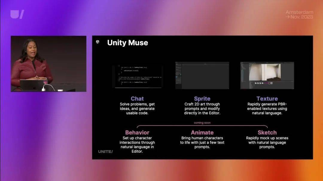 最后,Unity 谈到了其 AI 成就,比如以可加速模型推理速度的神经引擎 Sentis,以及已于近日上线的生成式 AI 助手 Muse,后者可以用于创建聊天文本、精灵与动画,还可以对行为进行编程。
