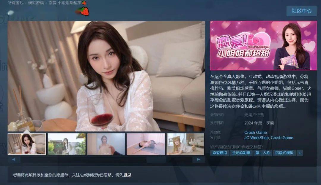 国产真人恋爱影像互动游戏再添新成员:由Crush Game制作的《恋爱!小姐姐都超甜🍓》现已上架Steam,计划发行日期: 2024 年第一季度。Steam页面显示,本作是该制作组的处女作。