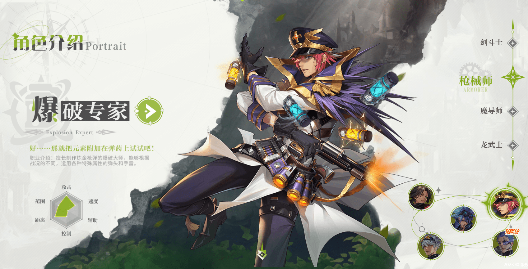爆破专家,枪械师的转职之一,专注于研究子弹与枪械的独特能力。在战场上,他所发射的每一颗子弹都带有独特的能力,如超高的穿透力、控制能力,甚至可以将敌人融化。然而,他的研究并未止步,我们期待他后续能带来更多新能力的子弹。