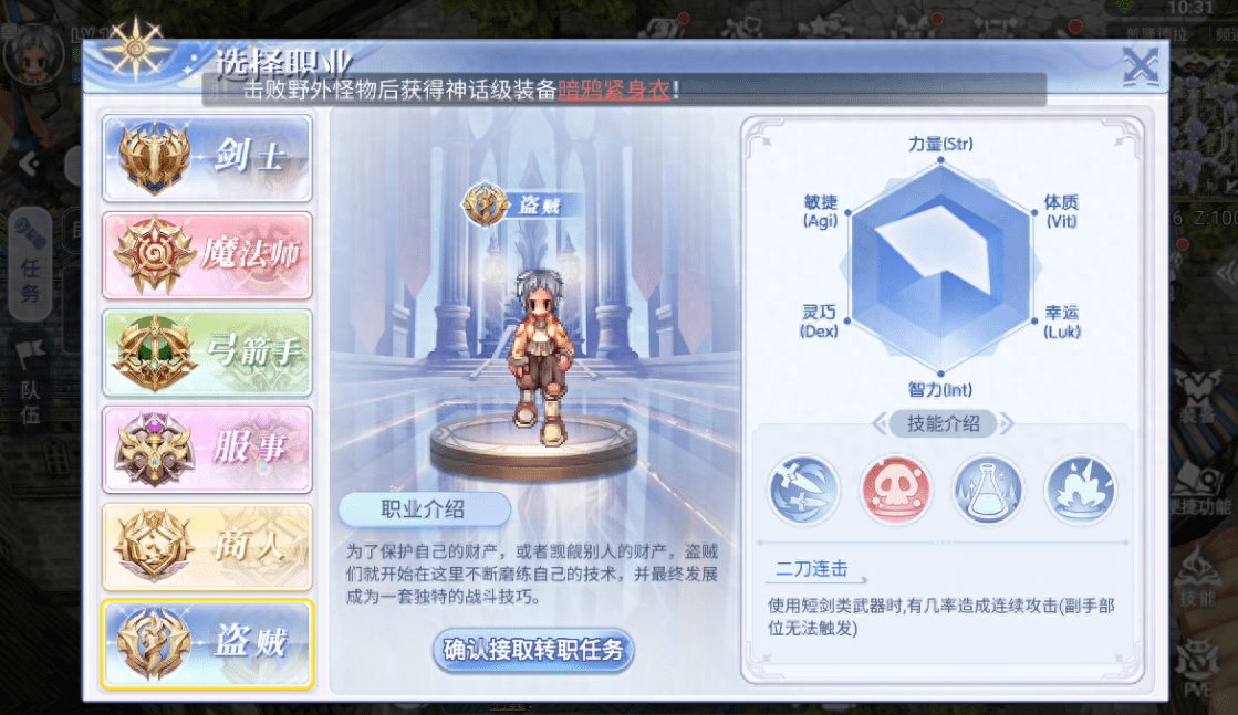 1.二刀连击:是双持刺客的核心技能之一,使用短剑类武器时,有20%几率造成连续攻击(副手部位无法触发),副手无法触发缺点,将在二转进行双持时完美触发。