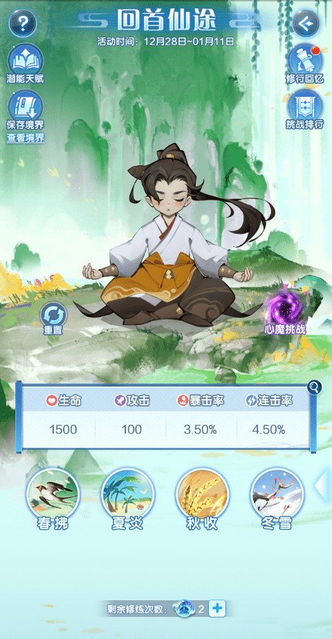● 道友过往的经历被浓缩为了四项属性,不同属性有不同的效果,通过回首自己过去可提升实力;道友可选择春夏秋冬四个不同的意境进行修炼,每次进行修炼有一定概率触发特殊事件,获得额外的属性加成或修炼加成;