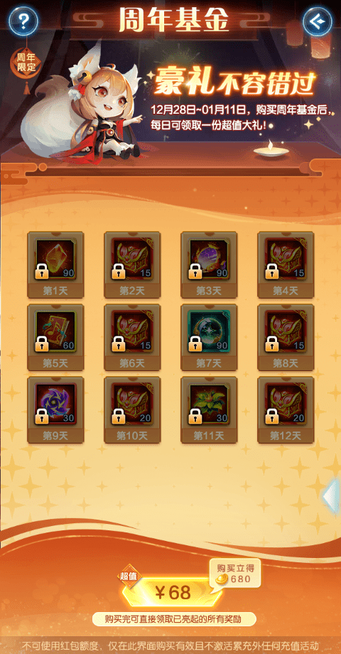 活动期间(12月28日-1月11日),每日解锁一份奖励(无论是否有登录)道友需要解锁基金后即可领取已激活的所有豪华奖励。