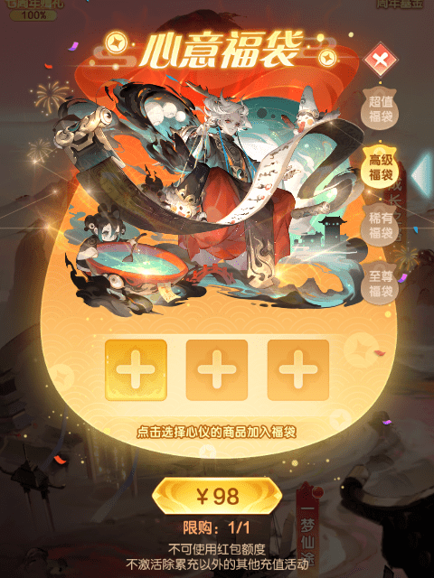 活动期间(12月28日-1月11日),道友可选择自己心仪的福袋进行购买,不同的福袋可选择的奖励内容不同,每个福袋仅可购买一次。
