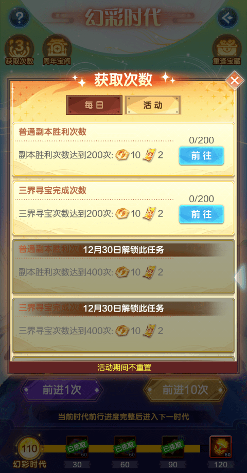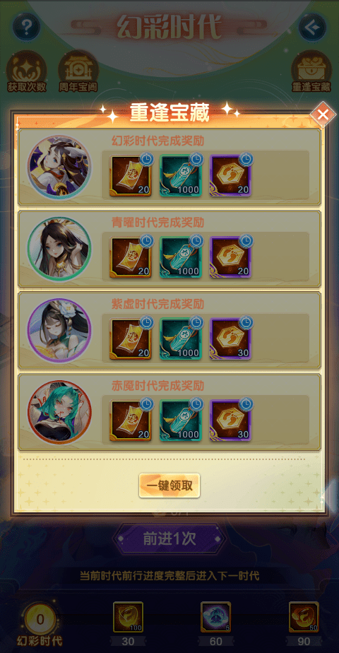 ● 玩家可经历幻彩时代→青曜时代→紫虚时代→赤魇时代→金霄时代...除赤魇时代外,每个时代有限定的次数,走完可获得对应时代的成就奖励