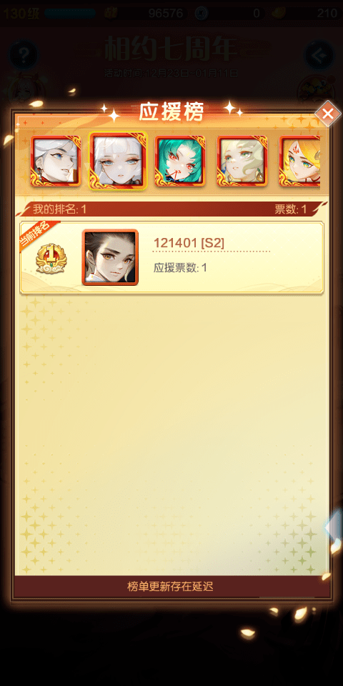 ● 各神仙投票最多的5名玩家将显示在应援榜上