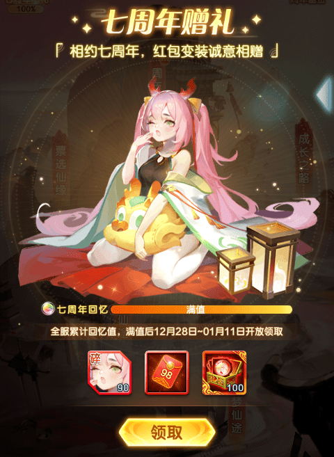 12月23日-12月27日期间,玩家参与仙界来客可积累七周年回忆,七周年回忆累计到满值即可在活动正式开启后(12月28日~1月11日)领取周年免费变装 『七周年·惬意』、98元红包奖励以及赤魇碎片奖励~