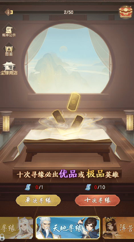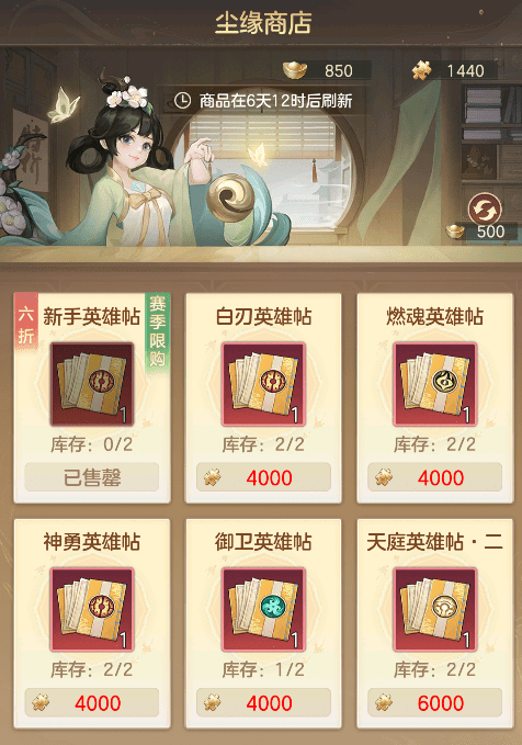游戏中玩家可通过完成主线任务、每日任务、每周任务和活动等方式获得金元宝,同时还会获得一定量的寻缘符和缘尘币。其中寻源符可用于直接抽取相应的卡池,而缘尘币可兑换英雄帖,玩家在缘尘商店兑换英雄帖后可在背包中使用,该道具会在范围内的英雄随机选择三位供玩家选择。此外,每个赛季开启时还会刷新两个6折折扣的新手英雄帖,若是想要快速提升自己的队伍,不妨试试兑换一下。