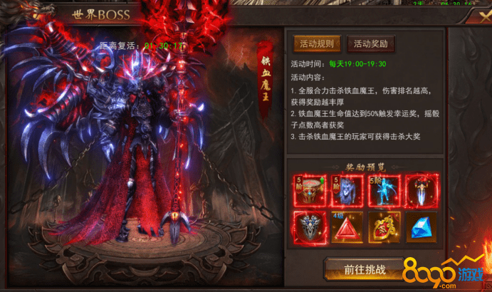 全服击杀铁血魔王: 所有玩家合力击败Boss,根据对Boss造成的伤害多少进行排名,排名越高,获得的奖励越丰厚。