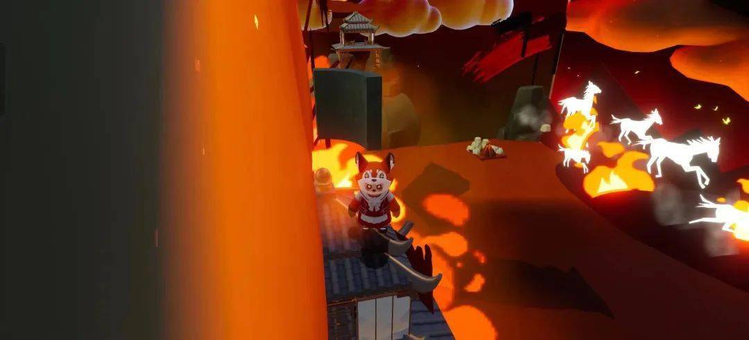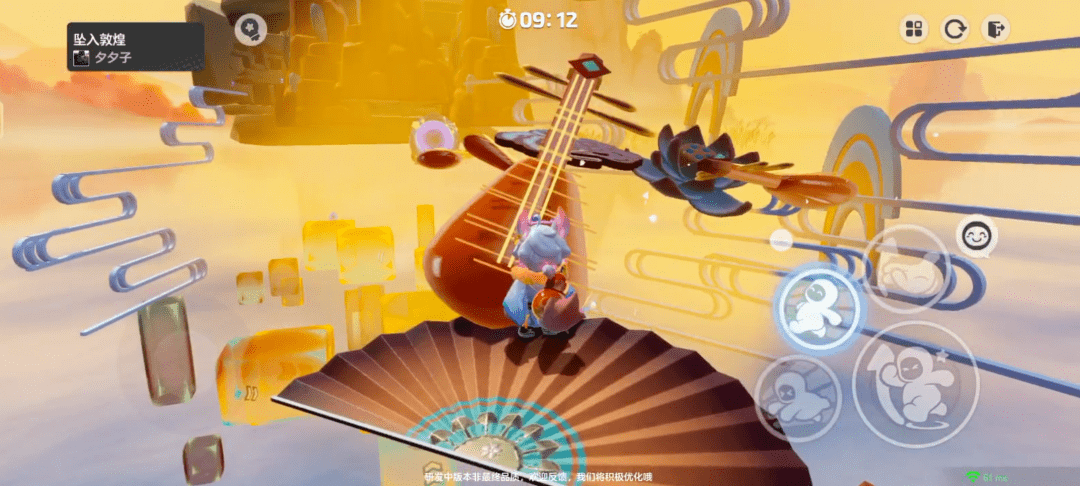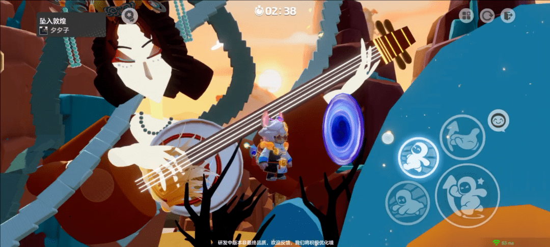 这是一张以平台跳跃玩法为主的竞速地图,玩家可以在其中见到大量敦煌相关的美术元素,在终点前则能一睹王子夕和谭慧婷用各类几何体调色一点点拼出来的飞天舞女像。